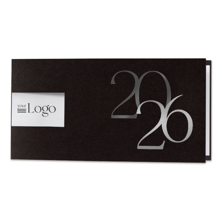 Zwarte nieuwjaarskaart met logo uitkap en 2026 in zwarte folie en zilverfolie