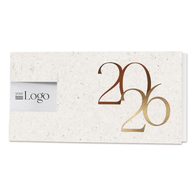 Nieuwjaarskaart recyclelook met venster en 2026 in bruine folie en goudfolie