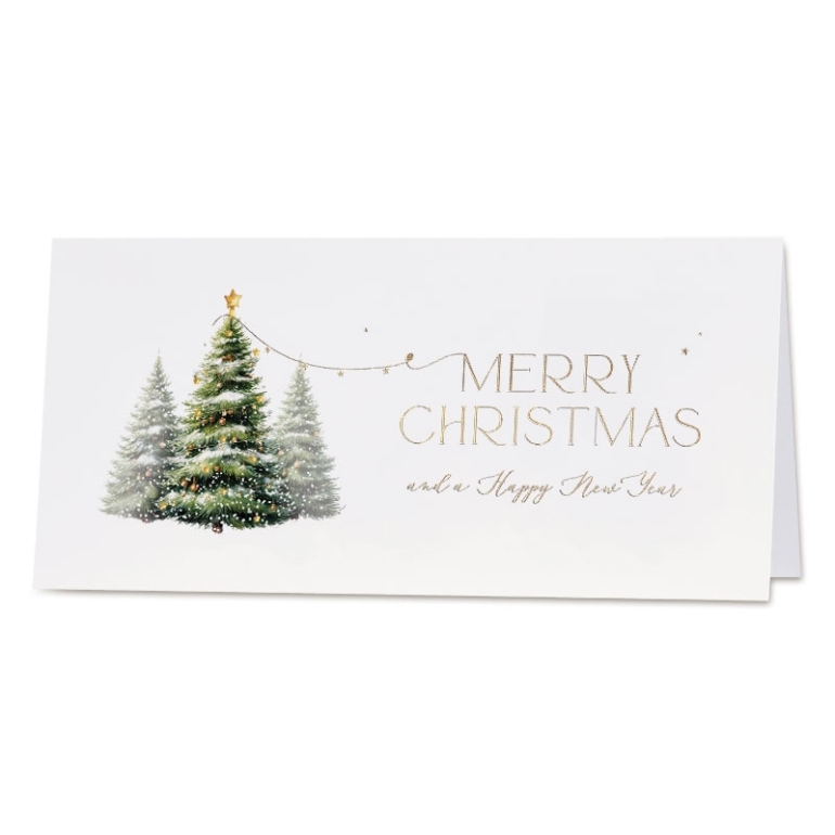 Feestelijke kerstkaart met besneeuwde kerstbomen en goudfolie