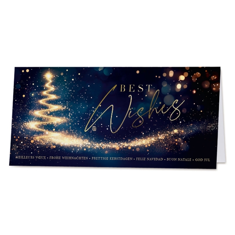Kerstkaart met fonkelende lichtboom en feestelijke glans