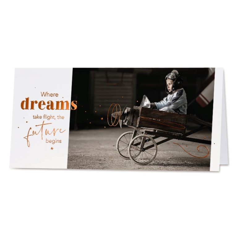 Charmante nieuwjaarskaart met jonge piloot in houten vliegtuig en koperfolie